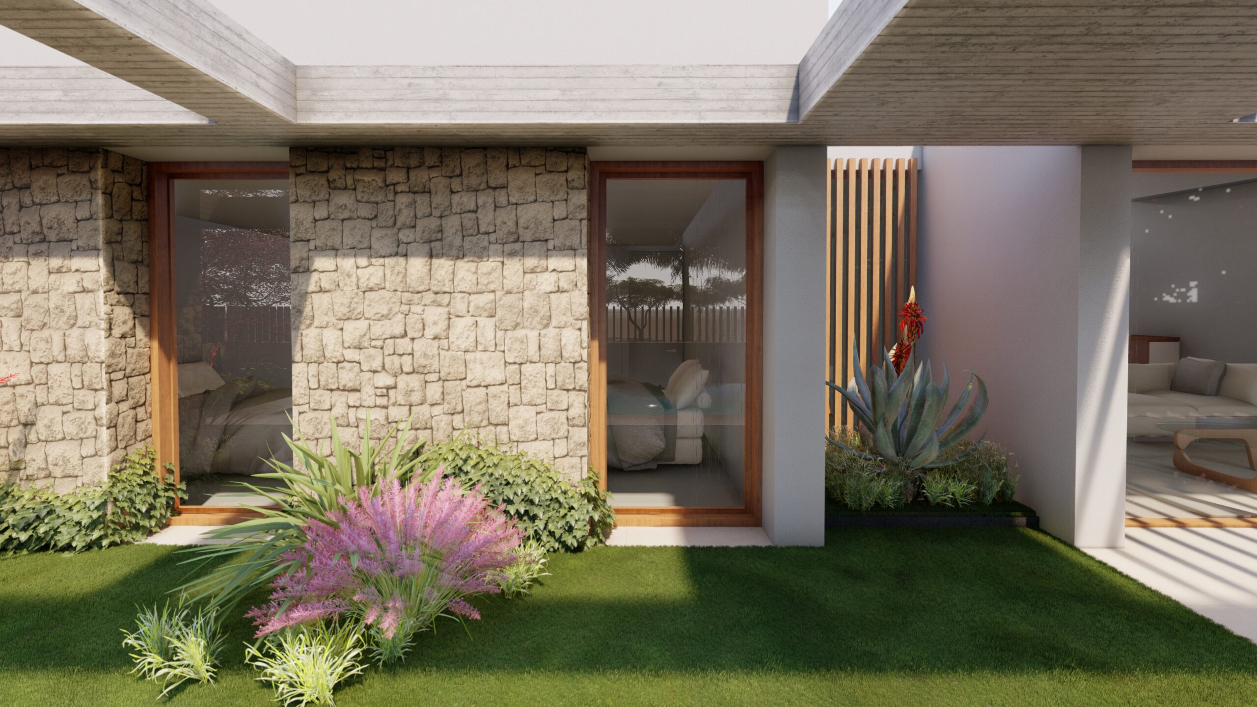 Hemos diseñado una viga perimetral de hormigón que envuelve y ordena los materiales para que lo doten de suavidad y calidez. Los materiales planteados son mortero de cal, madera y piedra, pudiéndose elegir por parte del propietario entre combinaciones de estos acabados. Arquitectura sostenible a través de los materiales, configuración arquitectónica, orientación, estudio de las condiciones climáticas y una serie de medidas para tener un alto ahorro energético, como un alto grado de aislamiento, sistema de aerotermia, renovación de aire, etc.